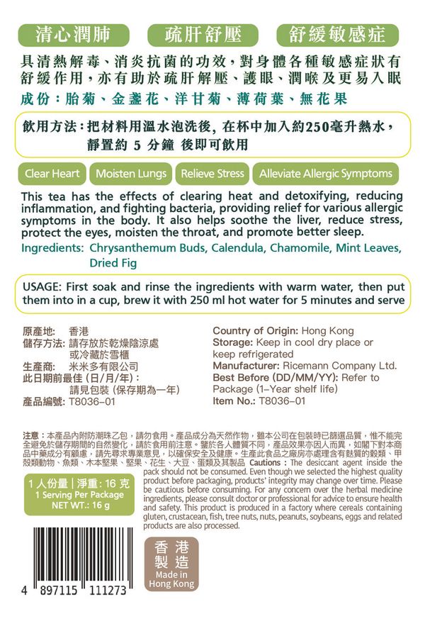 「本茶有助平衡身心,洋甘菊助放鬆神經,無花果補氣滋潤,胎菊清熱排毒,金盞花解熱緩敏,無論在辦公室忙碌的工作還是睡前放鬆都十分合適!」